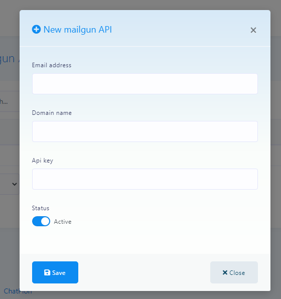 Click on New Mailgun API and a modal will appear to add sendgrid api. Fill up the form with necessary information and hit Save button.